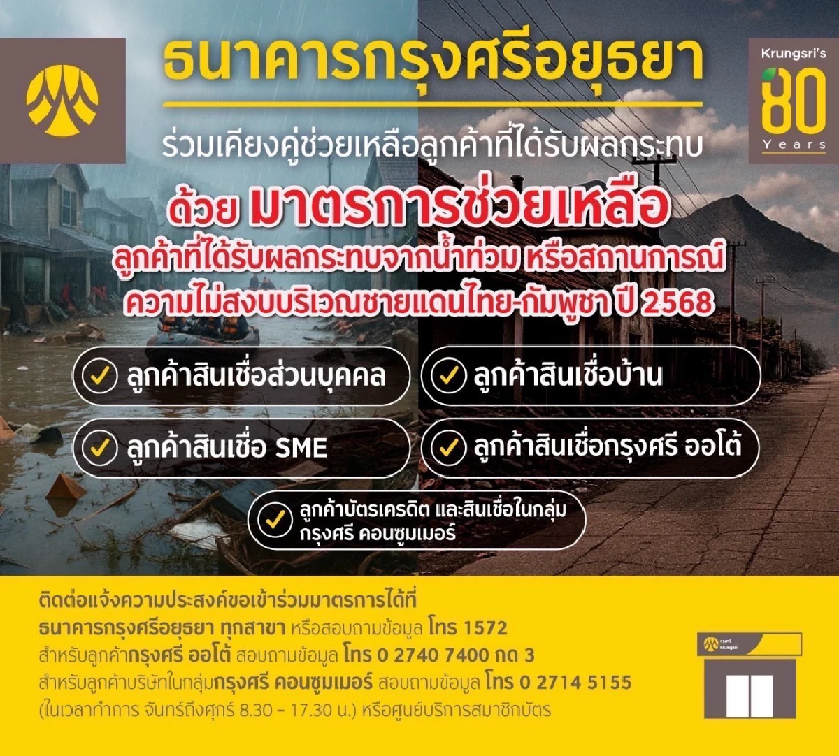 แจ้งความประสงค์ขอรับมาตรการช่วยเหลือได้ที่สาขาของธนาคารกรุงศรีอยุธยาทั่วประเทศ หรือ Krungsri Call Center 1572 ตั้งแต่วันนี้ ถึง 30 ธันวาคม 2568 โดยเงื่อนไขและเกณฑ์การพิจารณาลูกค้าแต่ละรายเป็นไปตามหลักเกณฑ์ที่ธนาคารกำหนด