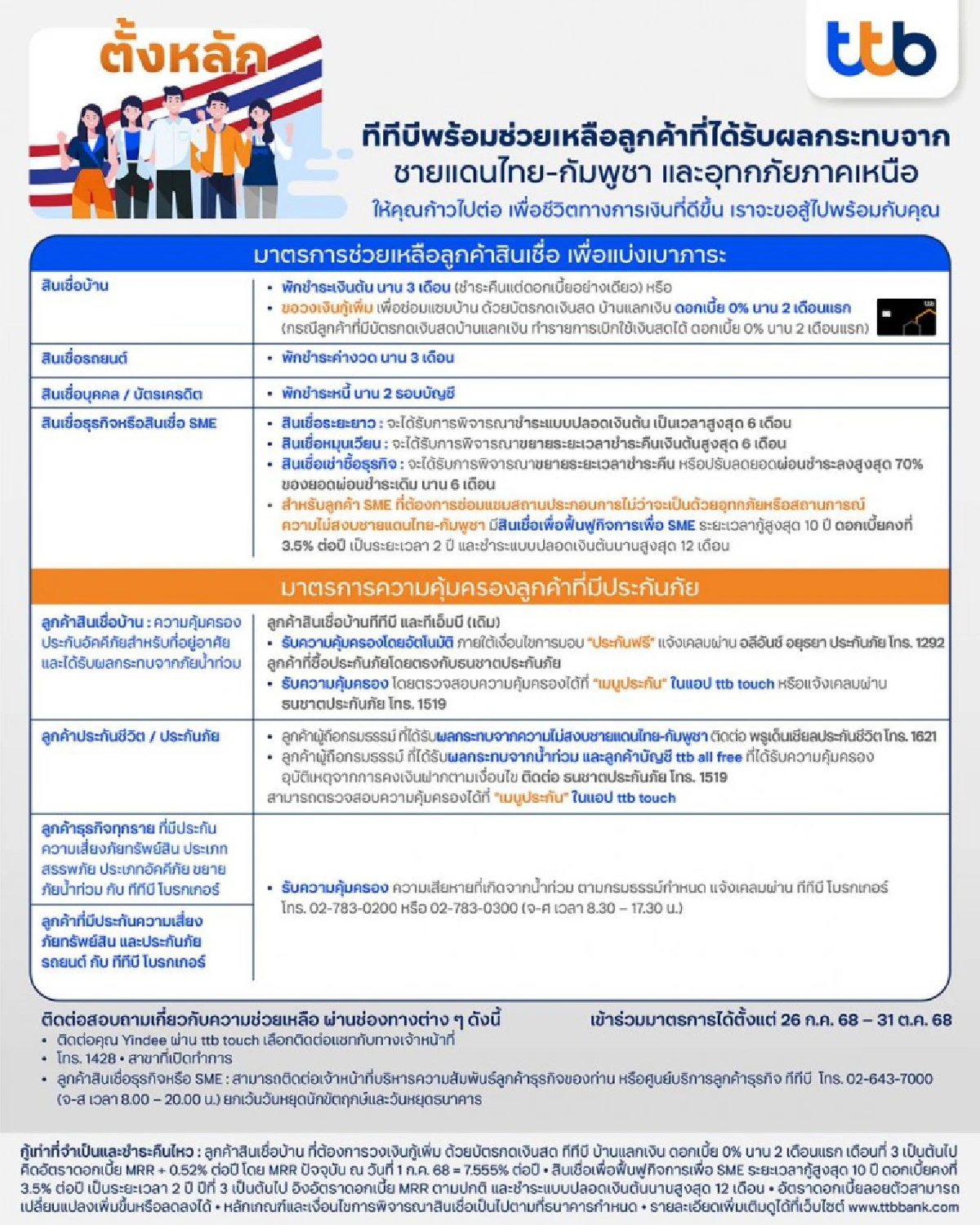 ทั้งนี้ ลูกค้าสามารถติดต่อเข้าร่วมมาตรการได้ตั้งแต่วันที่ 26 ก.ค. 68 – 31 ต.ค. 68 และสามารถติดต่อสอบถามรายละเอียดเพิ่มเติมได้ผ่าน 3 ช่องทาง ได้แก่ แอป ttb touch ผ่าน Yindee เลือกติดต่อแชทกับทางเจ้าหน้าที่ หรือ ttb contact center 1428 หรือ สาขาทีทีบี ที่เปิดทำการ