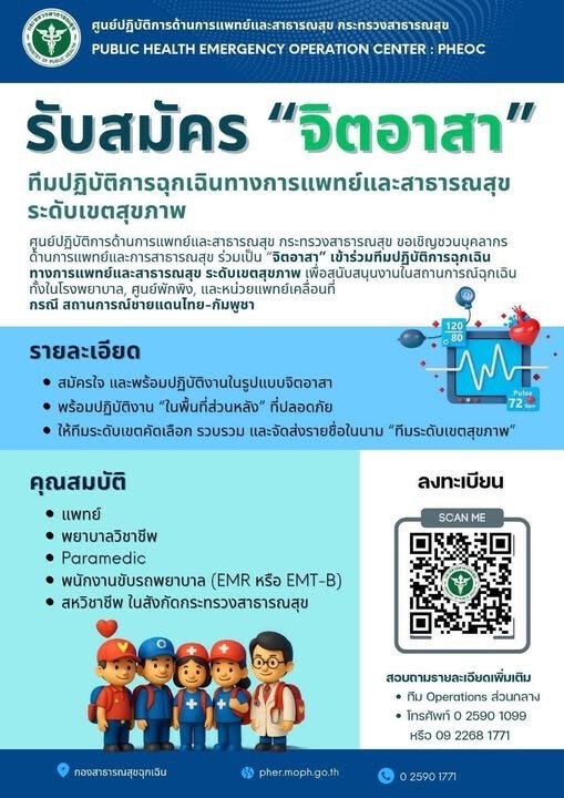 ศูนย์ปฏิบัติการด้านการแพทย์และสาธารณสุข กระทรวงสาธารณสุข (PUBLIC HEALTH EMERGENCY OPERATION CENTER : PHEOC) ประกาศรับสมัคร "จิตอาสา" ทีมปฏิบัติการฉุกเฉินทางการแพทย์และสาธารณสุข ระดับเขตสุขภาพ ร่วมปฏิบัติหน้าที่ในพื้นที่ชายแดนไทย-กัมพูชา