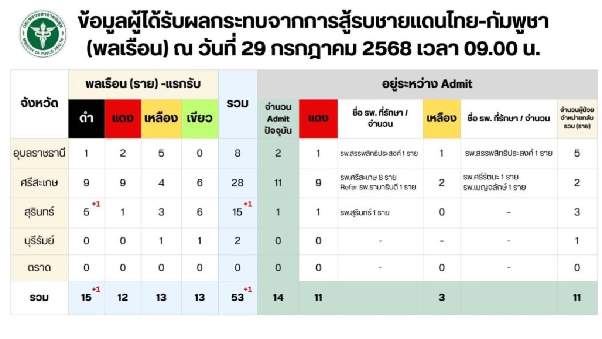 วันที่ 29 ก.ค.2568 นพ.วรตม์ โชติพิทยสุนนท์ โฆษกกระทรวงสาธารณสุข รายงานข้อมูลผู้ได้รับผลกระทบ (ฝั่งพลเรือน) โดยกระทรวงสาธารณสุขประจำวันที่ 29 กรกฎาคม 2568 ณ เวลา 11.00 น. โดยพบพลเรือนเสียชีวิต 15 ราย บาดเจ็บสาหัส 12 ราย บาดเจ็บปานกลาง 13 ราย และ บาดเจ็บเล็กน้อย 13 ราย รวม 53 ราย เป็นการเพิ่มขึ้นจากเมื่อวาน 1 ราย ที่ จ.สุรินทร์ ปัจจุบันกำลัง Admit อยู่ 14 ราย ยอดรวมจำหน่ายกลับบ้านไปได้แล้วรวม 11 ราย