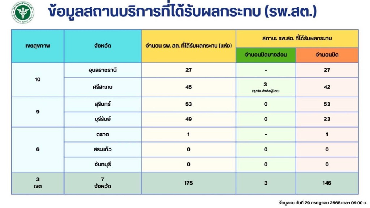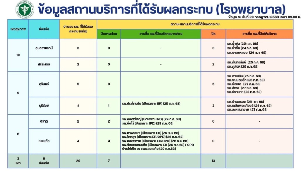 อัปเดตสถานการณ์ชายแดนไทยจากกัมพูชา “พลเรือน” เสียชีวิต 15 ราย รพ.รับผลกระทบ 20 แห่ง ปิดบริการรวม 13 แห่ง ส่งทีมปฏิบัติงานช่วยเหลือ 548 ทีม