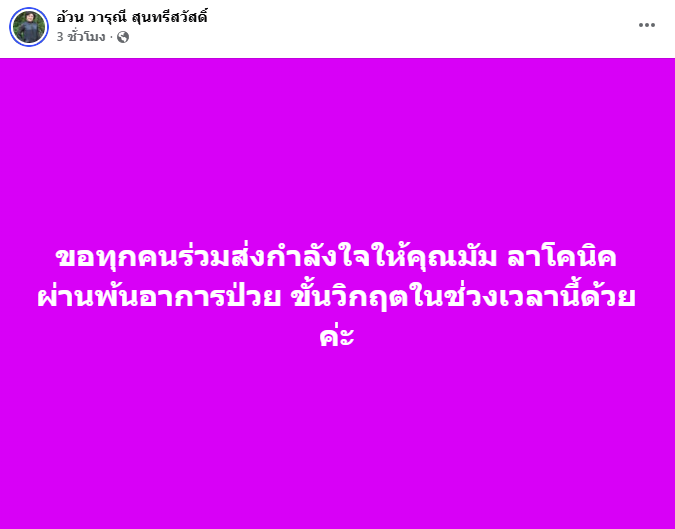 โดยเพื่อนสนิท “อ้วน วารุณี” ได้ออกมาแจ้งข่าวผ่านเฟซบุ๊กส่วนตัว “อ้วน วารุณี สุนทรีสวัสดิ์” ว่า “ขอทุกคนร่วมส่งกำลังใจให้คุณมัม ลาโคนิคส์ ผ่านพ้นอาการป่วยขั้นวิกฤต ในช่วงเวลานี้ด้วยค่ะ”