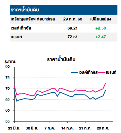 โดยราคาน้ำมันดิบเวสต์เทกซัสซื้อขายเมื่อ 29 ก.ค. 2568 อยู่ที่ 69.21 เหรียญสหรัฐต่อบาร์เรล เพิ่มขึ้น +2.50 เหรียญสหรัฐ และราคาน้ำมันดิบเบรนต์อยู่ที่ 72.51 เหรียญสหรัฐต่อบาร์เรล เพิ่มขึ้น +2.47 เหรียญสหรัฐต่อบาร์เรล