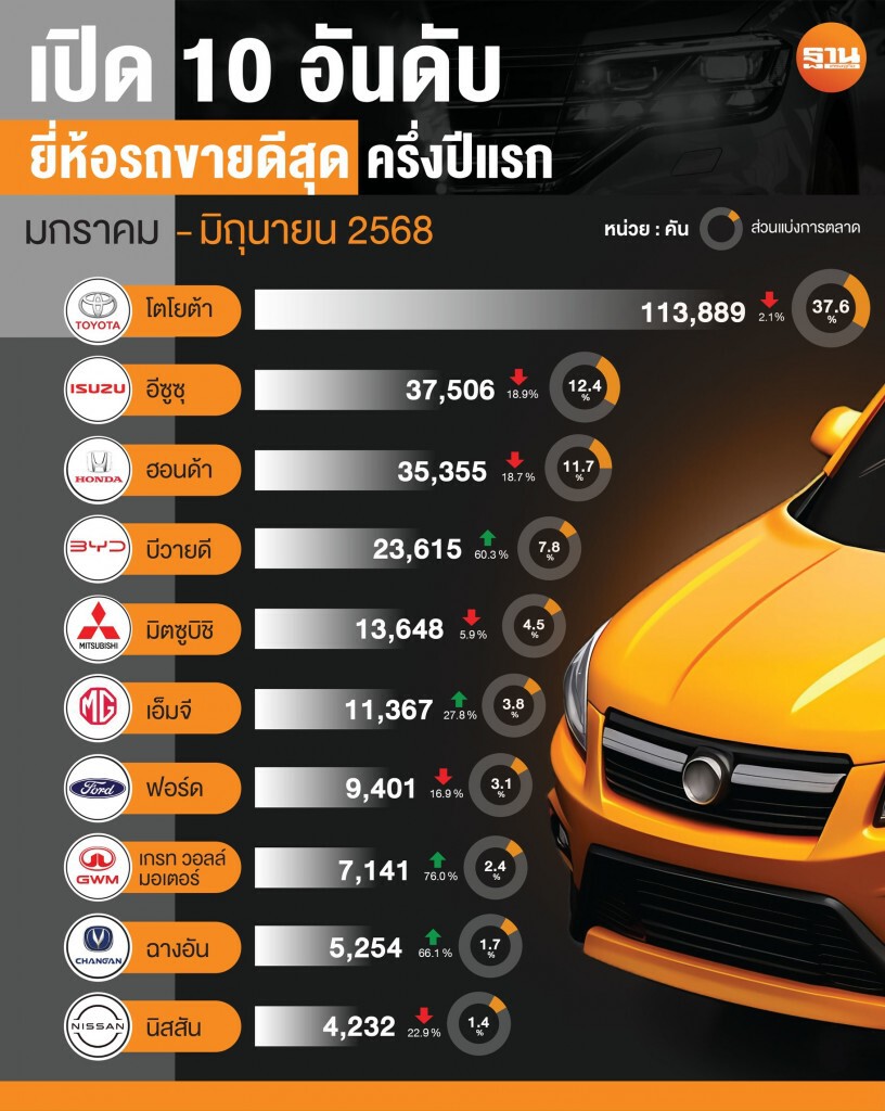 ที่มา : เช็ก 10 อันดับยี่ห้อรถขายดีสุดครึ่งปีแรก 68 ญี่ปุ่นยอดหด -EV จีนยอดพุ่ง
