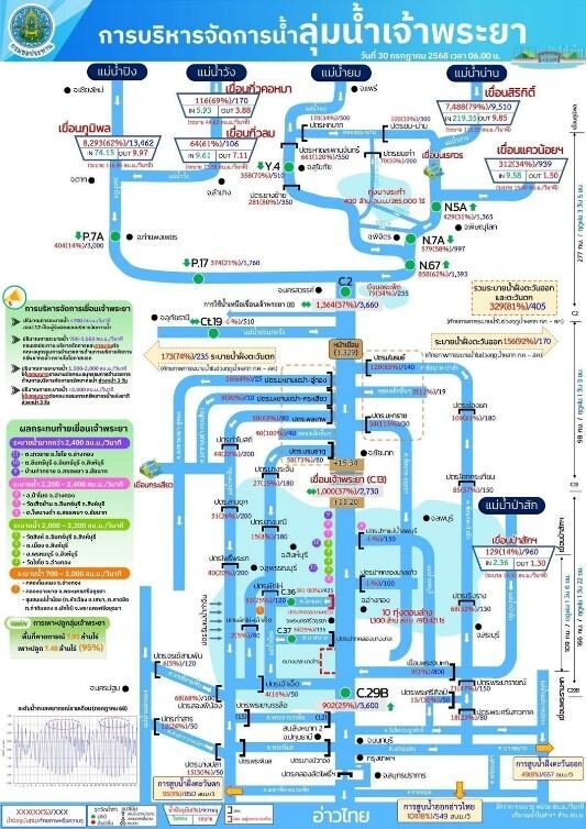 - กรมชลประทานทยอยปรับการระบายน้ำเพิ่มขึ้นเป็น 1,050 ลบ.ม./วินาที ภายใน เวลา 18.00 น. ของวันนี้ (30 ก.ค. 68) เพื่อให้สอดคล้องกับปริมาณน้ำจากทางตอนบน และลดผลกระทบต่อพื้นที่ด้านท้าย