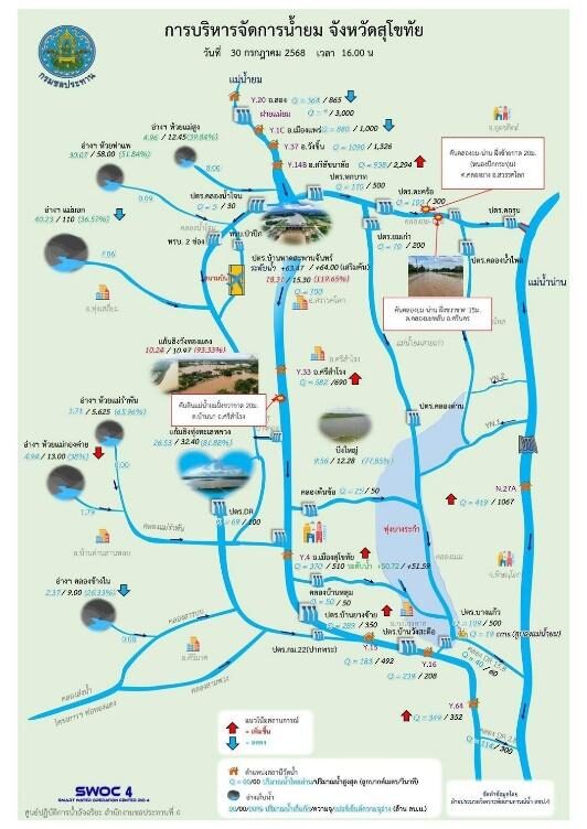 จังหวัดสุโขทัย: ระดับน้ำยังมีแนวโน้มเพิ่มขึ้นในบางพื้นที่ กรมชลประทานเร่งระบายน้ำจากแม่น้ำยมเข้าสู่แม่น้ำน่าน พร้อมเปิดบานระบายน้ำทุกจุดอย่างเต็มศักยภาพ เพื่อควบคุมระดับน้ำไม่ให้ล้นตลิ่งในเขตเมืองสุโขทัย