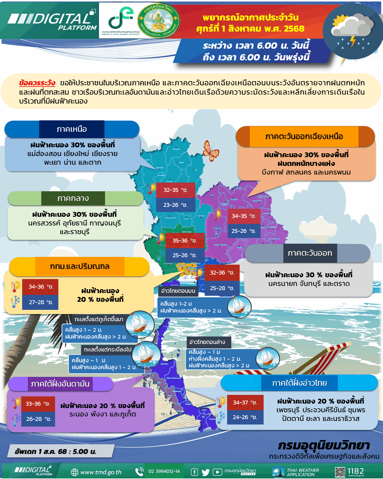 เมื่อวันที่ 1 สิงหาคม กรมอุตุนิยมวิทยา พยากรณ์อากาศ 24 ชั่วโมงข้างหน้า ประเทศไทยมีฝนน้อยแต่ยังคงมีฝนตกหนักบางแห่ง ภาคตะวันออกเฉียงเหนือตอนบน ขอให้ประชาชนในบริเวณดังกล่าวระวังอันตรายจากฝนตกหนักและฝนที่ตกสะสม ทั้งนี้เนื่องจากมีหย่อมความกดอากาศต่ำปกคลุมบริเวณประเทศเวียดนามตอนบน ประกอบกับมรสุมตะวันตกเฉียงใต้ที่พัดปกคลุมทะเลอันดามันประเทศไทย และอ่าวไทยมีกำลังอ่อน
