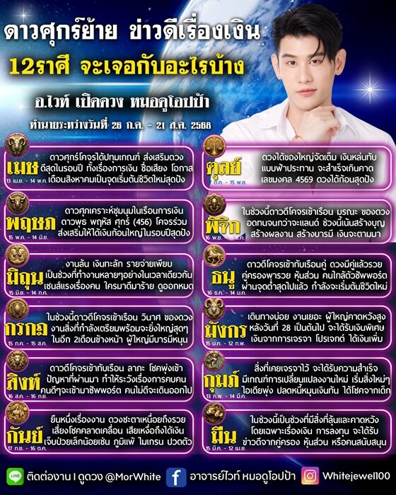 อ.ไวท์ หมอดูโอปป้า เผย ดาวศุกร์ย้าย ข่าวดีเรื่องเงิน 12 ราศีจะเจอกับอะไรบ้าง ระหว่างวันที่ 26 ก.ค.-21 ส.ค. 2568 ดังนี้