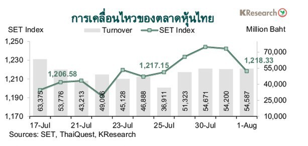 บริษัทหลักทรัพย์ (บล.)กสิกรไทย มองว่า ดัชนีหุ้นไทยมีแนวรับที่ 1,200 และ 1,190 จุด ขณะที่แนวต้านอยู่ที่ 1,230 และ 1,255 จุด ตามลำดับ โดยเมื่อวันศุกร์ที่ 1 ส.ค. 2568 ดัชนี SET ปิดที่ระดับ 1,218.33 จุด เพิ่มขึ้น 0.10% จากระดับปลายสัปดาห์ก่อน ขณะที่มูลค่าการซื้อขายเฉลี่ยต่อวันอยู่ที่ 53,695.21 ล้านบาท เพิ่มขึ้น 21.35% จากสัปดาห์ก่อน ส่วนดัชนี mai เพิ่มขึ้น 0.47% มาปิดที่ระดับ 249.41 จุด