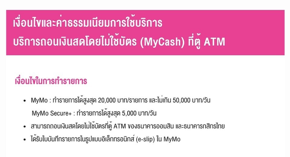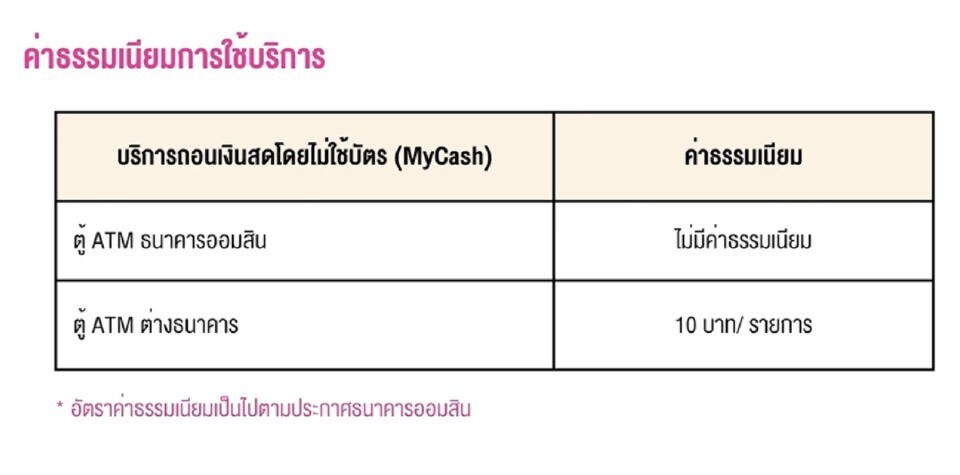 เงื่อนไขและค่าธรรมเนียมการใช้บริการ บริการถอนเงินสดโดยไม่ใช้บัตร (MyCash) ที่ตู้ ATM