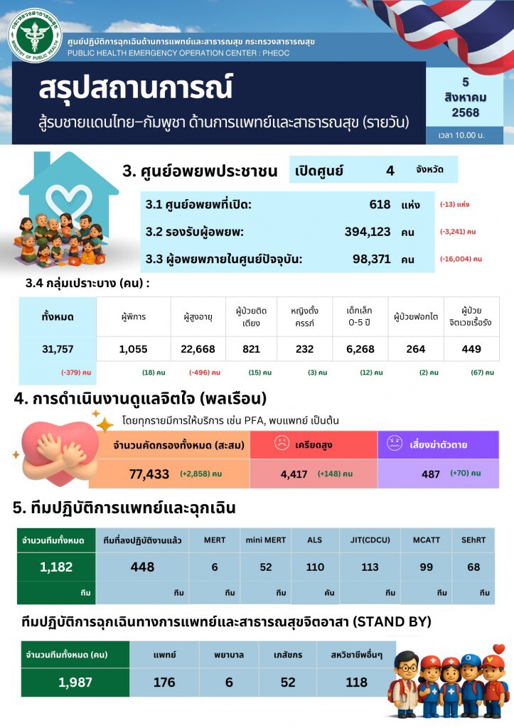 ที่มา : สาธารณสุข อัปเดตสถานการณ์ผลกระทบชายแดนไทย-กัมพูชา 5 ส.ค.68