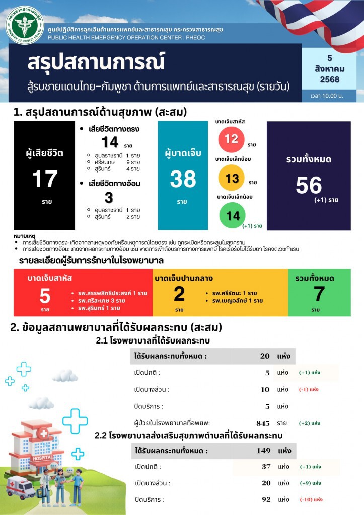 5 สิงหาคม 2568 กระทรวงสาธารณสุข โดยศูนย์ปฏิบัติการฉุกเฉินด้านการแพทย์และสาธารณสุข อัปเดตสถานการณ์จากเหตุปะทะชายแดนไทยกัมพูชาด้านการแพทย์และสาธารณสุข ประจำวันที่ 5 ส.ค. 2568 มีผู้บาดเจ็บและเสียชีวิตสะสมรวม 56 ราย เป็นผู้เสียชีวิตสะสม 17 ราย