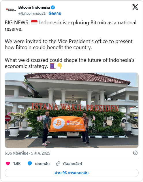 กลุ่ม Bitcoin Indonesia ได้โพสต์ข้อความผ่านแพลตฟอร์ม X (Twitter) ว่า “เราได้รับเชิญให้เข้าไปที่สำนักงานรองประธานาธิบดี เพื่อนำเสนอแนวทางว่า ประเทศจะได้รับประโยชน์จาก Bitcoin อย่างไร”