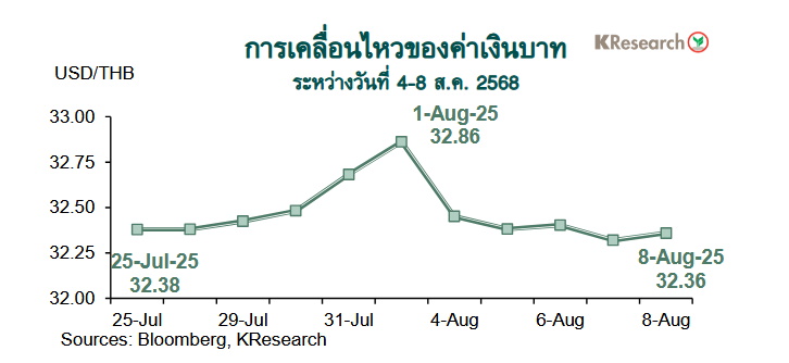 สำหรับสัปดาห์หน้า หรือระหว่างวันที่ 11-15 ส.ค. 2568 ธนาคารกสิกรไทยมองกรอบการเคลื่อนไหวของค่าเงินบาทที่ระดับ 32.10-32.80 บาทต่อดอลลาร์ฯ ขณะที่ศูนย์วิจัยกสิกรไทยประเมินปัจจัยสำคัญที่ต้องติดตาม ได้แก่ ผลการประชุม กนง. (13 ส.ค.) ทิศทางฟันด์โฟลว์ของต่างชาติและราคาทองคำในตลาดโลก