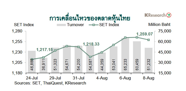 ในวันศุกร์ที่ 8 ส.ค. 2568 ดัชนี SET ปิดที่ระดับ 1,259.07 จุด เพิ่มขึ้น 3.34% จากระดับปลายสัปดาห์ก่อน ขณะที่มูลค่าการซื้อขายเฉลี่ยต่อวันอยู่ที่ 54,864.79 ล้านบาท เพิ่มขึ้น 2.18% จากสัปดาห์ก่อน ส่วนดัชนี mai เพิ่มขึ้น 2.24% มาปิดที่ระดับ 254.99 จุด