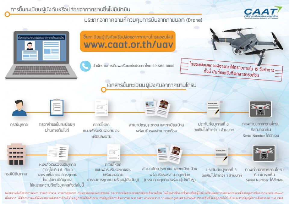 - ขึ้นทะเบียนผู้บังคับหรือปล่อยอากาศยานโดรนออนไลน์ www.caat.or.th/uav