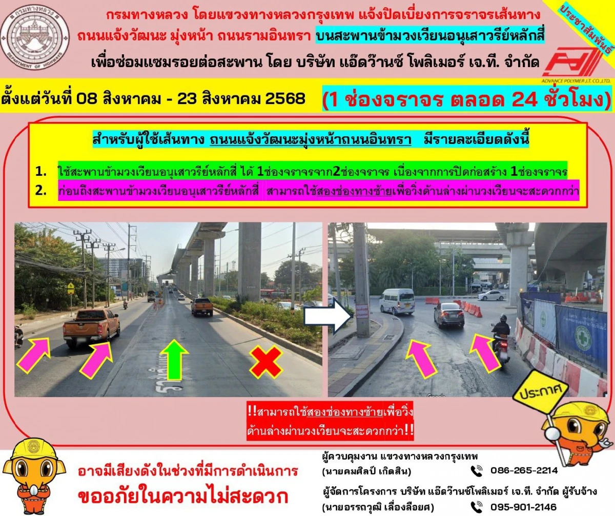 กรมทางหลวง แจ้ง ปิดเบี่ยงการจราจร ถนนแจ้งวัฒนะ ข้ามไปลงถนนรามอินทรา มุ่งหน้ามีนบุรี บนสะพานข้ามวงเวียนบางเขน เพื่อซ่อมแซมรอยต่อสะพาน ตั้งแต่วันที่ 08 สิงหาคม หลังเวลา 22.00 น. เป็นต้นไป - 23 สิงหาคม 2568 จำนวน 1 ช่องจราจร ตลอด 24 ชั่วโมง