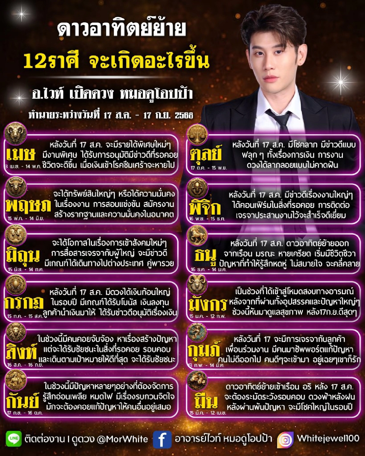 "อาจารย์ไวท์" เปิดดวง 12 ราศี ฟ้าหลังฝน มีโชคใหญ่ ราศีได้เงินก้อนใหญ่ในรอบปี หลังดาวอาทิตย์ย้าย 17 สิงหาคม 2568
