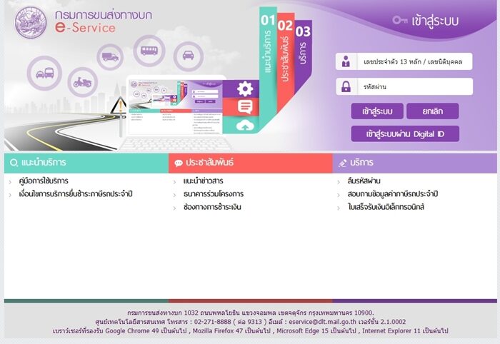 - ทั้งนี้ ระบบจะทำการตรวจสอบประกันภัยภาคบังคับ (พ.ร.บ.) ของรถที่จะดำเนินการชำระค่าภาษีรถประจำปี โดยการเชื่อมโยงและตรวจสอบข้อมูลกับระบบคอมพิวเตอร์ของสำนักงานคณะกรรมการกำกับและส่งเสริมการประกอบธุรกิจประกันภัย (คปภ.)