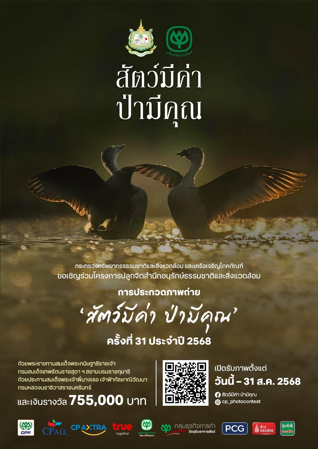 ขอเชิญชวนประชาชนและเยาวชนที่รักการถ่ายภาพธรรมชาติเตรียมเข้าป่าสะพายกล้อง แล้วกดชัตเตอร์รัวๆ เพื่อถ่ายทอดเรื่องราวคุณค่าของทรัพยากรสัตว์ป่าและป่าไม้เมืองไทยอันงดงาม รวมทั้งความสมบูรณ์ของธรรมชาติให้สังคมได้รับรู้กับโครงการปลูกจิตสำนึกอนุรักษ์ธรรมชาติและสิ่งแวดล้อม การประกวดภาพถ่าย ‘สัตว์มีค่า ป่ามีคุณ’ ปีที่ 31 ชิงถ้วยพระราชทานสมเด็จพระกนิษฐาธิราชเจ้า กรมสมเด็จพระเทพรัตนราชสุดา ฯ สยามบรมราชกุมารี และถ้วยประทานสมเด็จพระเจ้าพี่นางเธอ เจ้าฟ้ากัลยาณิวัฒนา กรมหลวงนราธิวาสราชนครินทร์ พร้อมเงินรางวัล 755,000 บาท โดยแบ่งการประกวดเป็น 2 ระดับ คือ ระดับบุคคลทั่วไป และระดับนักเรียน นิสิต นักศึกษา ซึ่งได้กำหนดหัวข้อที่หลากหลายในการนำเสนอทั้งประเภทสัตว์มีค่า และประเภทป่ามีคุณ พร้อมถ่ายทอดเรื่องราวความงดงาม ความอุดมสมบูรณ์ของธรรมชาติ สัตว์ป่า สัตว์น้ำ และป่าไม้ผ่านภาพถ่าย และในปีนี้ได้กำหนดให้มีการประกวดคลิปวิดีโอ ‘สัตว์มีค่า’ เพิ่มขึ้น อันเป็นส่วนหนึ่งในการสร้างความรัก สร้างความตระหนัก และปลูกฝังการอนุรักษ์ธรรมชาติให้ยั่งยืน ผู้สนใจสามารถส่งผลงานภาพถ่ายทั้งประเภทสัตว์ป่า ป่าไม้ และคลิปวิดีโอ ‘สัตว์มีค่า’ เข้าประกวดได้ตั้งแต่วันนี้ – 31 สิงหาคม 2568 ส่งภาพถ่ายได้ที่ https://www.trueplookpanya.com/event/photocontest/login และดูรายละเอียดที่ Facebook Fanpage : สัตว์มีค่า ป่ามีคุณ Instagram : cp_photocontest หรือสอบถามข้อมูลเพิ่มเติมได้ที่เครือเจริญโภคภัณฑ์ โทร 0-2858-6837 หรือ สำนักอนุรักษ์สัตว์ป่า กรมอุทยานแห่งชาติ สัตว์ป่า และพันธุ์พืช ถ.พหลโยธิน เขตจตุจักร กรุงเทพฯ 10900 โทร 0-2579-6666 ต่อ 1641-2