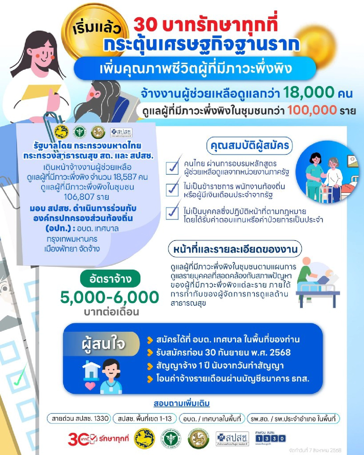 รัฐบาลเปิดรับสมัครผู้ช่วยเหลือผู้มีภาวะพึ่งพิง 18,587 อัตรา รายได้ 5,000–6,000 บาทต่อเดือน โอนผ่าน ธ.ก.ส. สมัครได้ที่ อบต. หรือเทศบาลพื้นที่ตนเอง ก่อน 30 ก.ย. 68