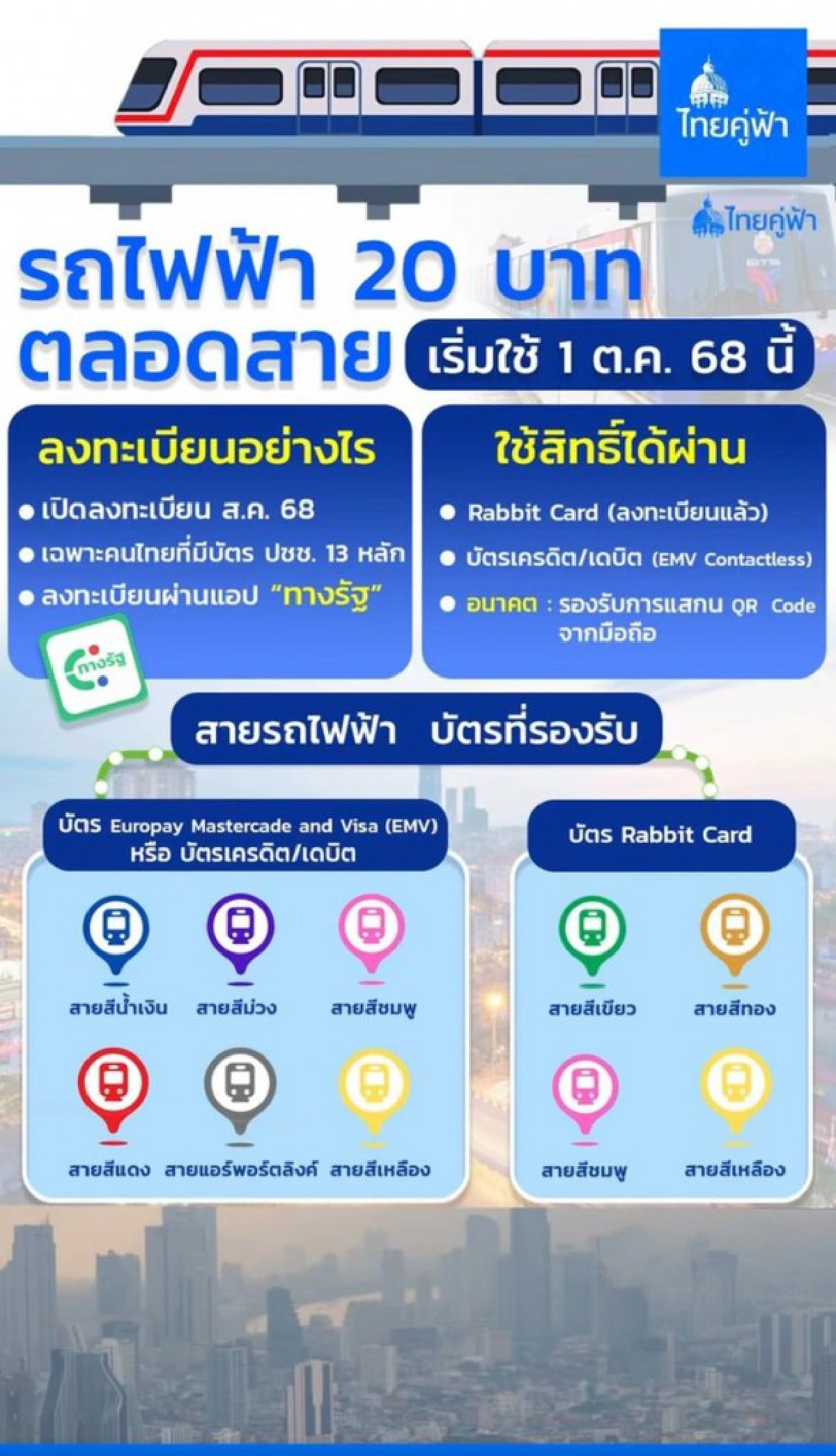 ลงทะเบียนรถไฟฟ้า 20 บาท ตลอดสาย เริ่ม 25 ส.ค. 68 ใช้สิทธิ์ได้ 1 ต.ค. 68 ครอบคลุม 8 สาย 194 สถานี