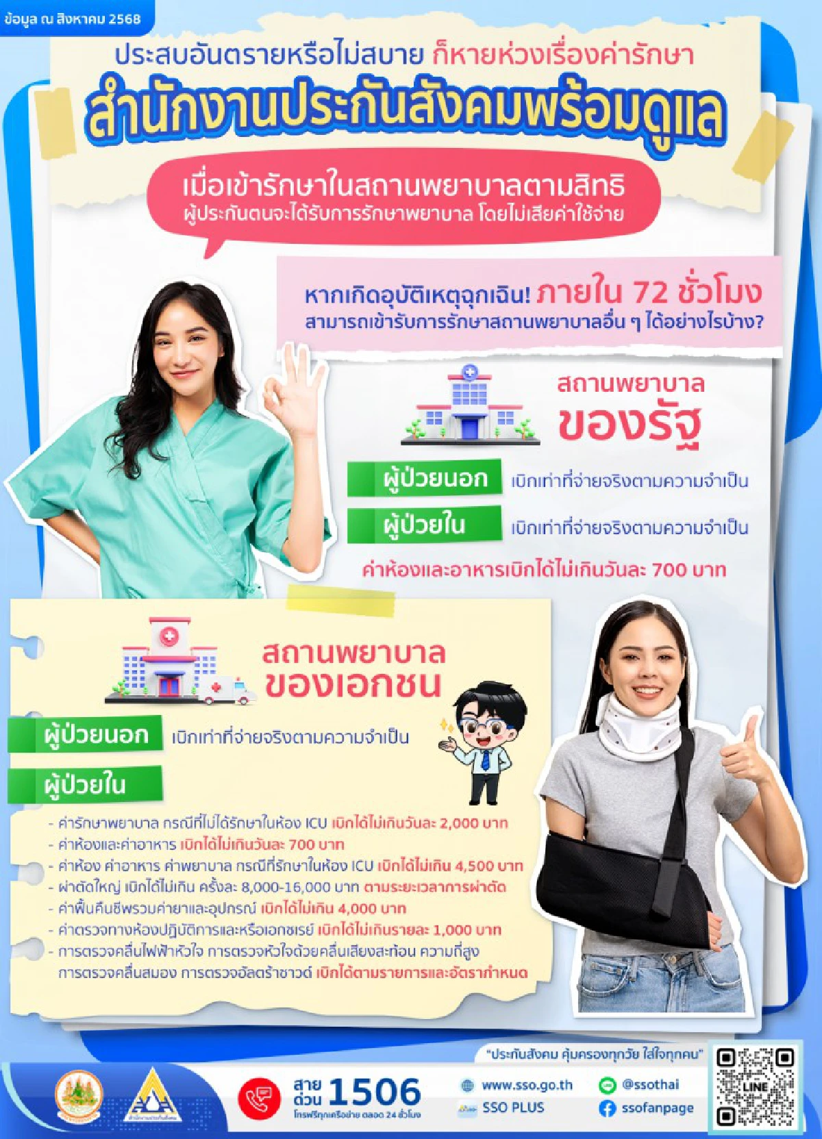 "สำนักงานประกันสังคม" ดูแลค่ารักษาผู้ประกันตนมาตรา 33 และมาตรา 39 เมื่อเข้ารักษาในสถานพยาบาลตามสิทธิ ผู้ประกันตนจะได้รับการรักษาพยาบาลโดยไม่เสียค่าใช้จ่าย พร้อมเปิดเงื่อนไข "หากเกิดอุบัติเหตุฉุกเฉิน ภายใน 72 ชั่วโมง" สามารถเข้ารับการรักษาสถานพยาบาลอื่น ๆ ได้