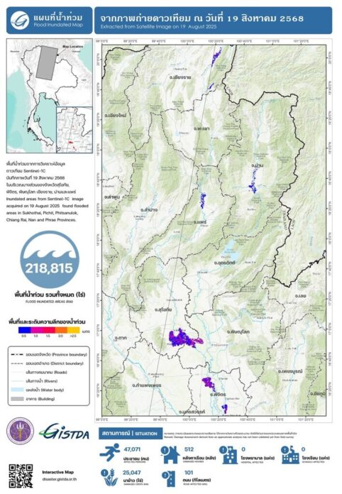 เมื่อวันที่ 20 ส.ค.68 กระทรวงการอุดมศึกษา วิทยาศาสตร์ วิจัยและนวัตกรรม (อว.) โดยสำนักงานพัฒนาเทคโนโลยีอวกาศและภูมิสารสนเทศ หรือ GISTDA ติดตามสถานการณ์น้ำท่วมขังด้วยข้อมูลจากดาวเทียม Sentinel-1C ของเมื่อวานนี้ (19ส.ค.) พบว่ามีพื้นที่บางส่วนของ 6 จังหวัดภาคเหนือ ได้แก่ สุโขทัย พิจิตร พิษณุโลก เชียงราย น่าน และแพร่ ที่ได้รับผลกระทบจากน้ำท่วมขังแล้วทั้งสิ้น 218,815 ไร่