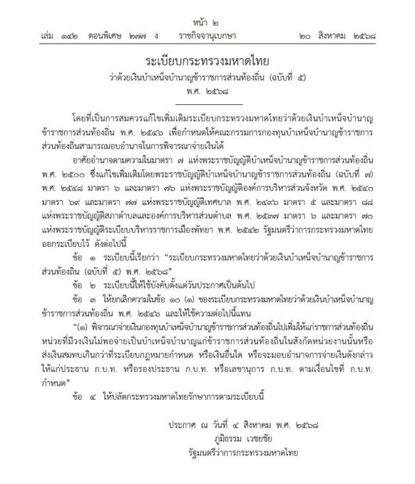 ราชกิจจานุเบกษา เผยแพร่ ระเบียบกระทรวงมหาดไทยใหม่ ว่าด้วยเงินบำเหน็จบำนาญข้าราชการส่วนท้องถิ่น (ฉบับที่ 5) พ.ศ.2568 ให้ ก.บ.ท. มอบอำนาจจ่ายเงินได้