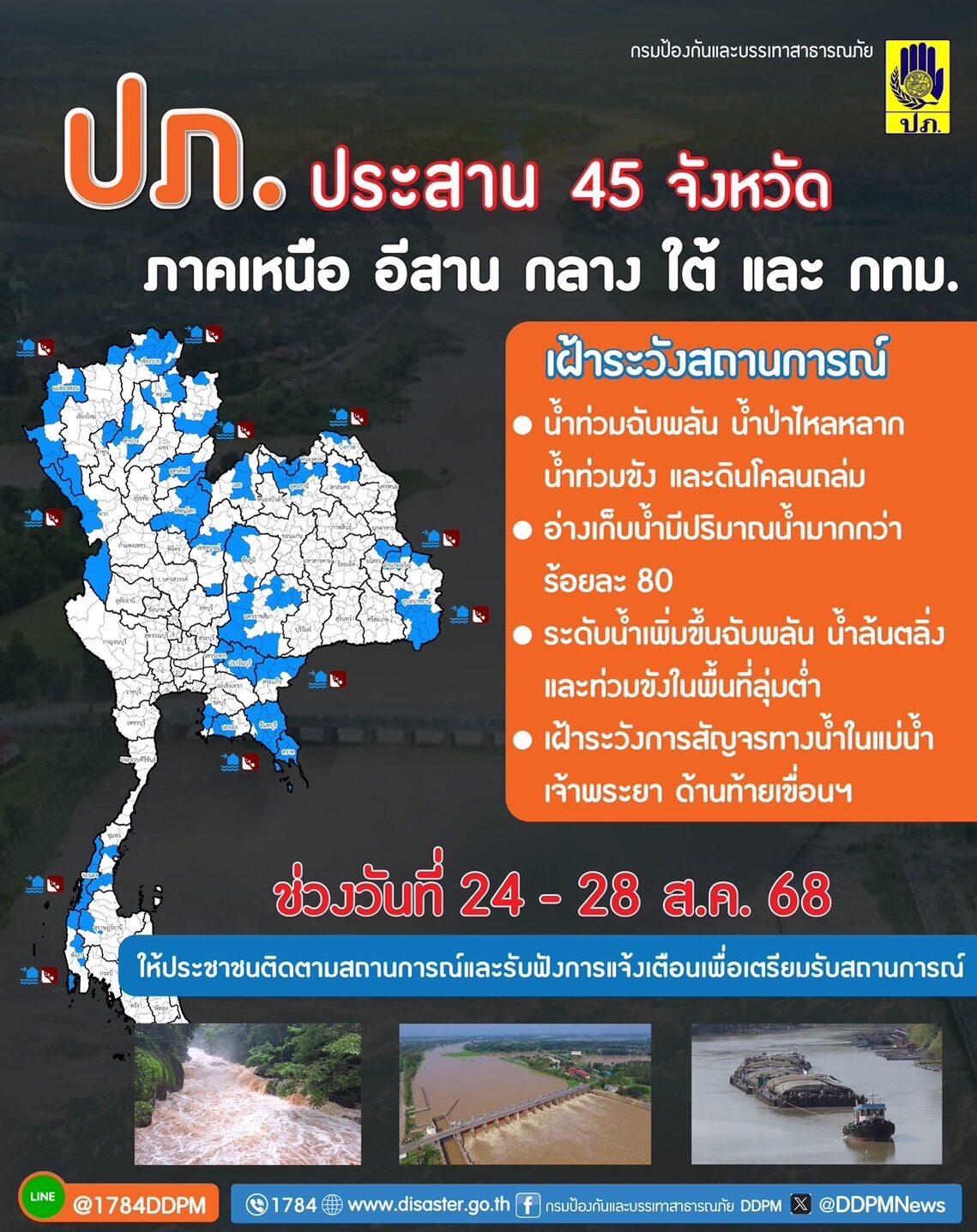 ปภ.เตือน 45 จังหวัด เหนือ อีสาน กลาง ใต้ กทม. เฝ้าระวังน้ำท่วมฉับพลัน น้ำป่า น้ำท่วมขัง ดินโคลนถล่ม เขื่อนเจ้าพระยาระบายน้ำเพิ่มช่วง 24 – 28 ส.ค.