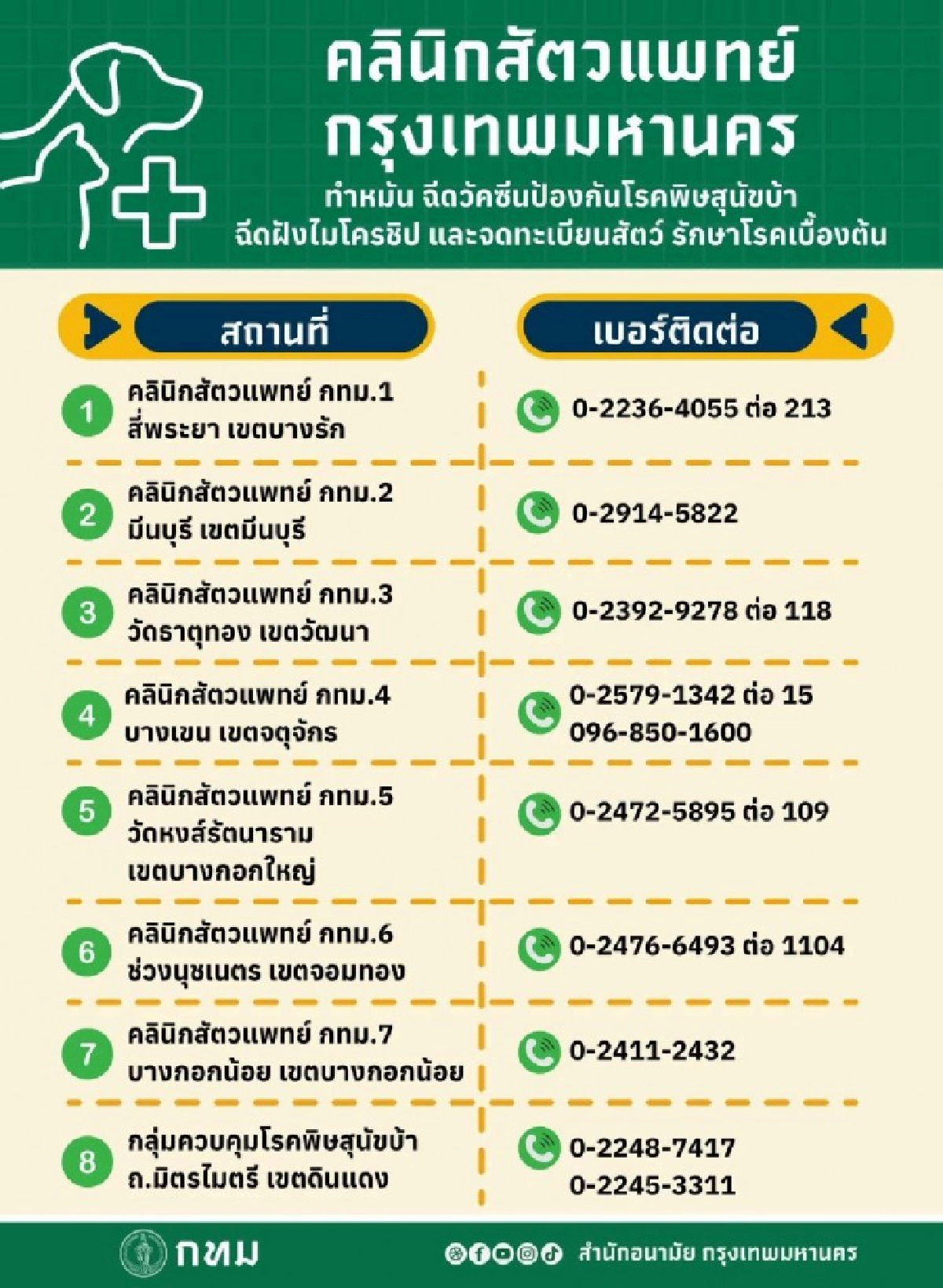 8. คลินิกสัตวแพทย์ กทม.7 เขตบางกอกน้อย โทร. 0 2411 2432
