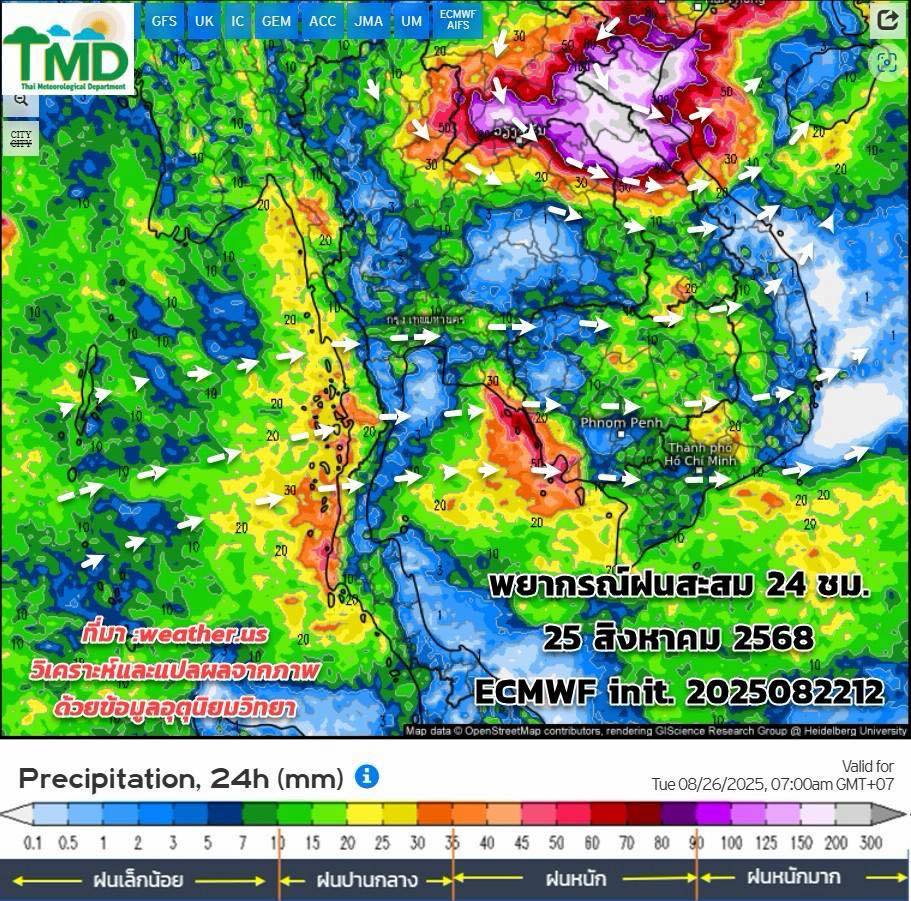 ช่วงวันที่ 24 – 27 ส.ค.68 ประกอบกับมรสุมตะวันตกเฉียงใต้ที่พัดเข้าหาศูนย์กลางของพายุ มีกำลังแรงขึ้น รวมทั้งร่องมรสุมที่จะพาดผ่านบริเวณประเทศไทยตอนบนในช่วงนี้ ต้องเฝ้าระวังสภาวะฝนที่ตกหนักและฝนตกสะสม อาจทำให้เกิดสภาวะน้ำท่วมฉับพลันน้ำป่าไหลหลาก น้ำล้นตลิ่งได้
