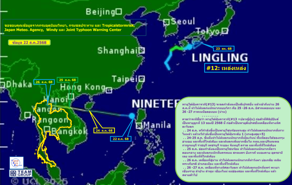 ทั้งนี้เนื่องจากอิทธิพลของพายุที่คาดว่าจะอ่อนกำลังลงเป็นหย่อมความกดอากาศต่ำกำลังแรงเคลื่อนตัวเข้ามาปกคลุมภาคเหนือและภาคอีสาน ประกอบกับมีแนวร่องมรสุมพาดผ่าน ทำให้มีฝนตกหนักถึงหนักมากได้บางแห่ง ซึ่งสอดคล้องกับโอกาสการก่อตัวของพายุหมุนเขตร้อนในทะเลจีนใต้ มีเพิ่มขึ้น (มากกว่า 80 %)ในช่วงดังกล่าว มีแนวโน้มจะทวีกำลังแรงขึ้นเป็นพายุโซนร้อนหรือโซนร้อนกำลังแรง ต้องติดตามอย่างใกล้ชิดและต่อเนื่อง ช่วง 24 -27 ส.ค.68 และเตรียมความพร้อมรับสถานการณ์