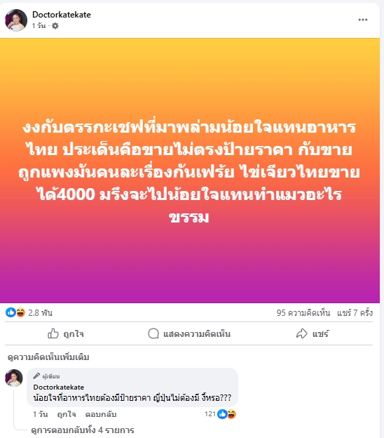 “หมอของขวัญ” สวนแรง ปมไข่เจียวเจ๊ไฝ 4,000 ชี้ประเด็นคือ “ป้ายไม่ตรงราคา!”