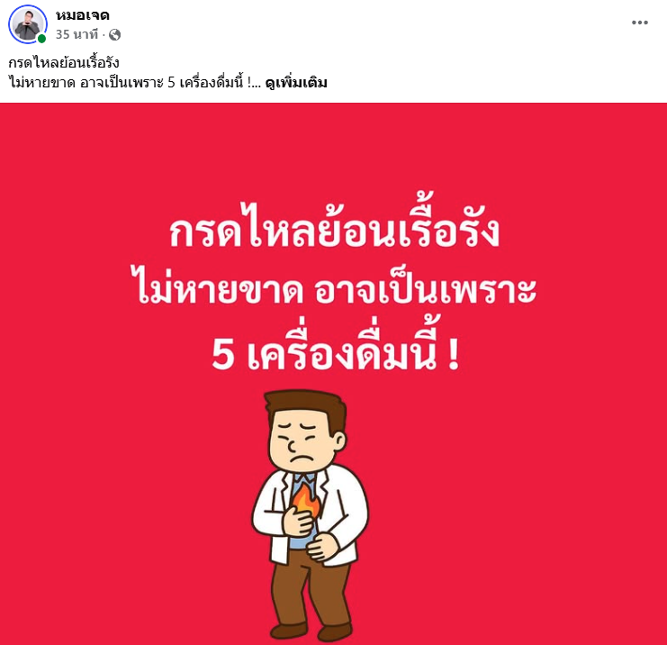 นพ.เจษฎ์ บุณยวงศ์วิโรจน์ รองผู้อำนวยการกิจการด้านปฐมภูมิ โรงพยาบาลมหาราชนครราชสีมา โพสต์เฟซบุ๊ก “หมอเจด” เกี่ยวกับอาการกรดไหลย้อน ระบุข้อความว่า กรดไหลย้อนเรื้อรัง ไม่หายขาด อาจเป็นเพราะ 5 เครื่องดื่มนี้!