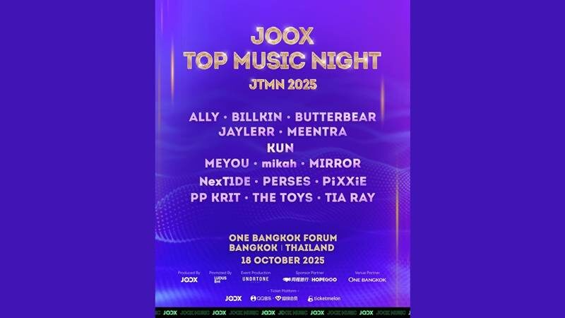 เตรียมพบกับปรากฏการณ์ทางดนตรีครั้งสำคัญ! Tencent Music Entertainment Group ประกาศอย่างเป็นทางการในวันที่ 20 สิงหาคม ว่า JOOX แพลตฟอร์มสตรีมมิงเพลงชั้นนำระดับโลก เตรียมจัดงาน ‘JOOX Top Music Night 2025’ (JTMN 2025) มหกรรมดนตรีสุดยิ่งใหญ่ พร้อมประกาศไลน์อัพสุดอลัง ที่จะยกทัพศิลปินเอเชียชั้นนำกว่า 15 กลุ่ม มารวมตัวกันที่กรุงเทพฯ ในวันที่ 18 ตุลาคมนี้