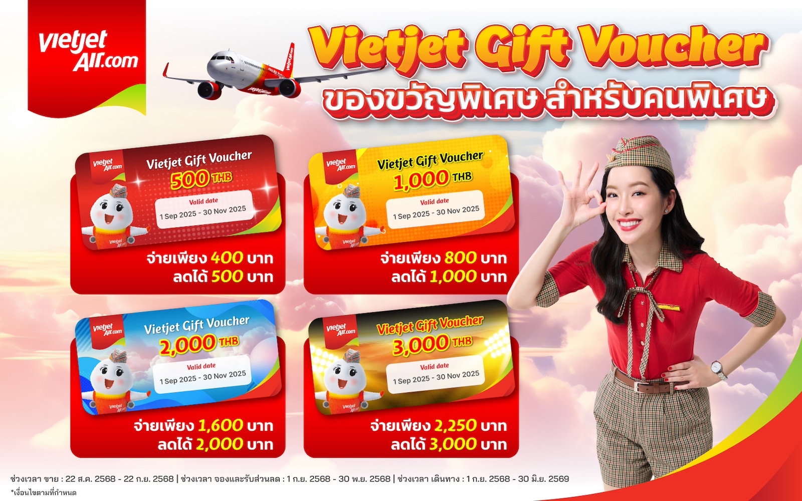 เวียตเจ็ทไทยแลนด์ ชวนมอบความสุขผ่าน Vietjet Gift Voucher ของขวัญแห่งการเดินทางสุดพิเศษ เพิ่มมูลค่าสูงสุดถึง 25% ใช้จองตั๋วเครื่องบินทั้งในและต่างประเทศ พร้อมวางจำหน่ายแล้วถึงวันที่ 22 กันยายนนี้