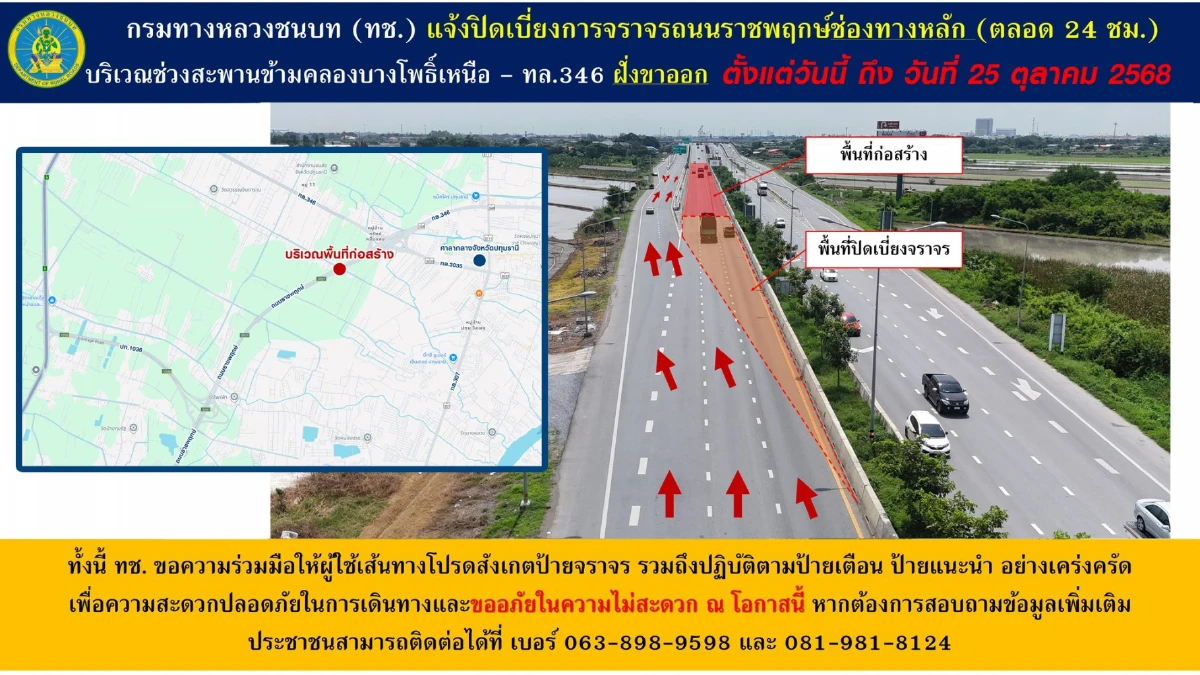 ผู้ใช้ทางเช็กด่วน! ทช. แจ้ง 'ปิดเบี่ยงจราจร' ถนนราชพฤกษ์ ช่องทางหลัก ช่วงสะพานข้ามคลองบางโพธิ์เหนือ ฝั่งขาออก ตลอด 24 ชั่วโมง ตั้งแต่วันนี้ - 25 ต.ค. 68