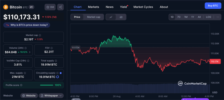 ในขณะที่รายงาน ราคา บิตคอยน์ กำลังซื้อขายอยู่ที่ 110,173 ดอลลาร์ ลดลง 1.13% ภายใน 24 ชั่วโมง อ้างอิงข้อมูลจาก coinmarketcap