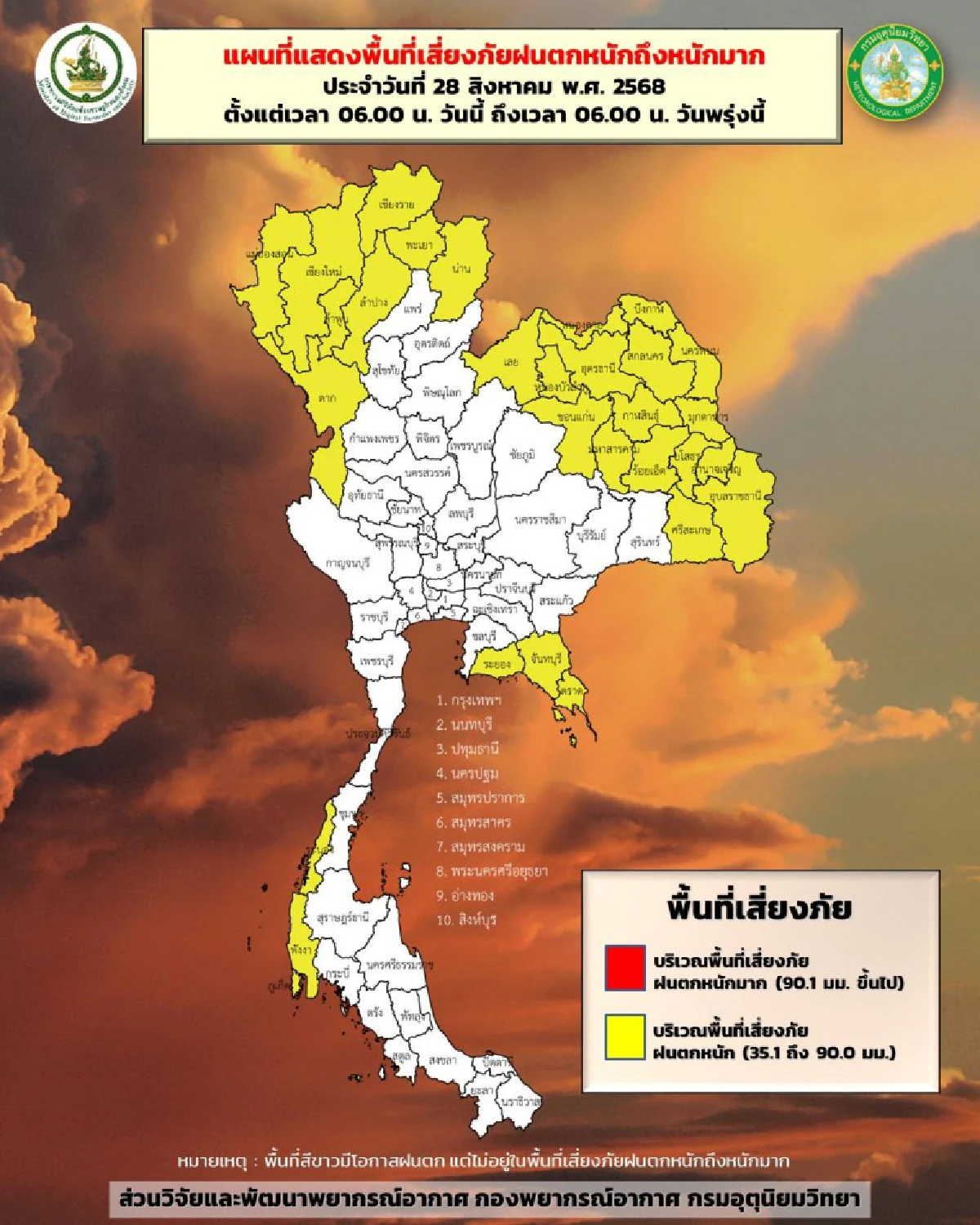 “ฝนยังไม่หมด” สภาพอากาศวันนี้ กรมอุตุ พยากรณ์อากาศวันนี้ 28 ส.ค.68 เตือนวันนี้ ฝนถล่มอีสาน ฝนตกหนักสุด ร้อยละ 70 ส่วนพื้นที่ กทม. ฝนฟ้าคะนอง อุณหภูมิสูงสุด 34 องศาเซลเซียส