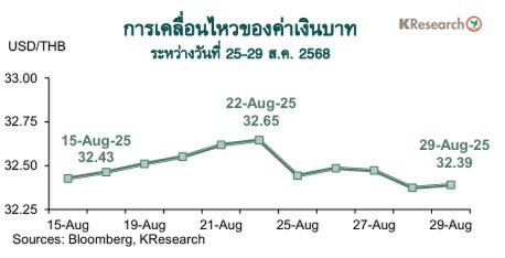 ธนาคารกสิกรไทยมองกรอบการเคลื่อนไหวของค่าเงินบาทระหว่างวันที่1-5 ก.ย. 68 ที่ระดับ 31.80-32.80 บาทต่อดอลลาร์ฯจากเมื่อวันศุกร์ที่ 29 ส.ค. 2568 เงินบาทปิดตลาดในประเทศที่ 32.39 บาทต่อดอลลาร์ฯ เทียบกับระดับ 32.65 บาทต่อดอลลาร์ฯ ในวันศุกร์ก่อนหน้า (22 ส.ค.)