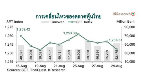 ศูนย์วิจัยกสิกรไทยประเมินปัจจัยสำคัญที่ต้องติดตาม ได้แก่ ตัวเลขเงินเฟ้อเดือนส.ค. ของไทย ประเด็นการเมืองในประเทศ รวมถึงทิศทางเงินทุนต่างชาติ ส่วนข้อมูลเศรษฐกิจสหรัฐฯ ที่สำคัญ ได้แก่ ดัชนี PMI/ISM ภาคการผลิตและการบริการ ข้อมูลการจ้างงานภาคเอกชนของ ADP ตัวเลขการจ้างงานนอกภาคเกษตร และอัตราการว่างงานเดือนส.ค.
