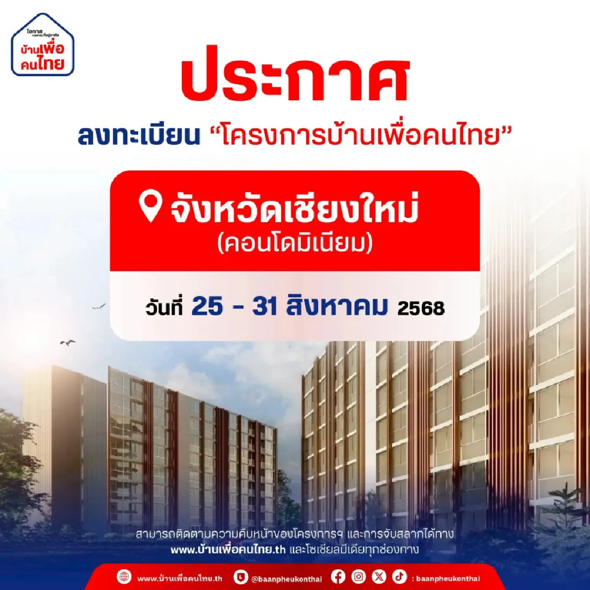ใกล้ปิดระบบ ลงทะเบียน "บ้านเพื่อคนไทย" คอนโดเชียงใหม่ เฟส 2 ผ่อน 4,000 บาท/เดือน เปิดจองคอนโดหรู 250 ยูนิต ทำเลทอง เดินทางสะดวก เข้าระบบ จองสิทธิเลย www.บ้านเพื่อคนไทย.th