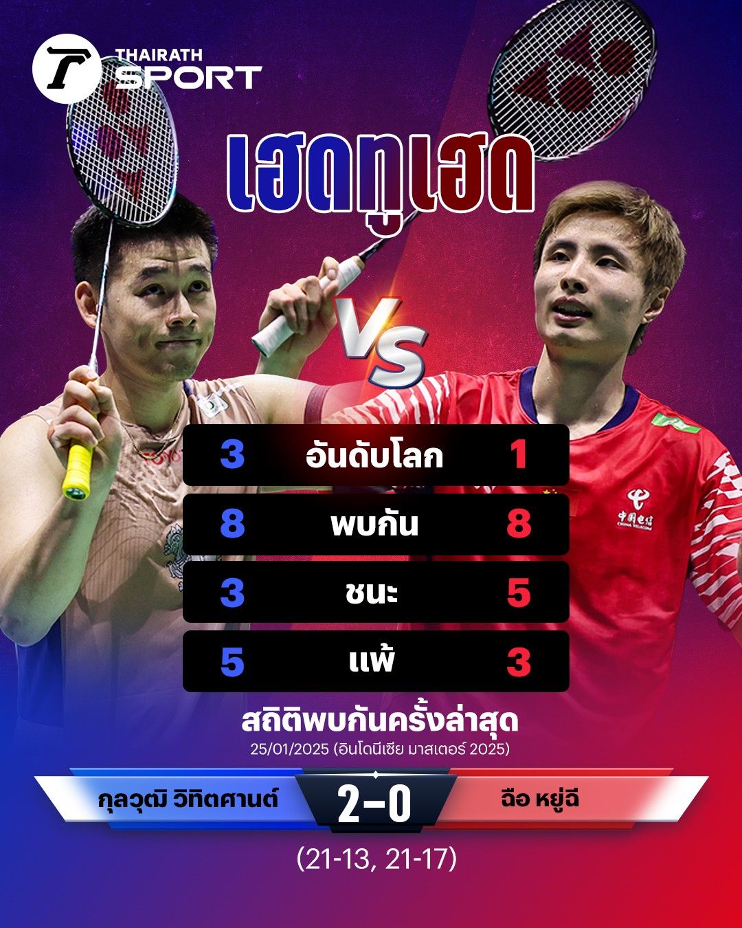 ที่มา : ลุ้นป้องกันแชมป์! ส่องสถิติ H2H "วิว กุลวุฒิ" VS "ฉือ หยู่ฉี" ก่อนนัดชิงแบดมินตันโลก 2025
