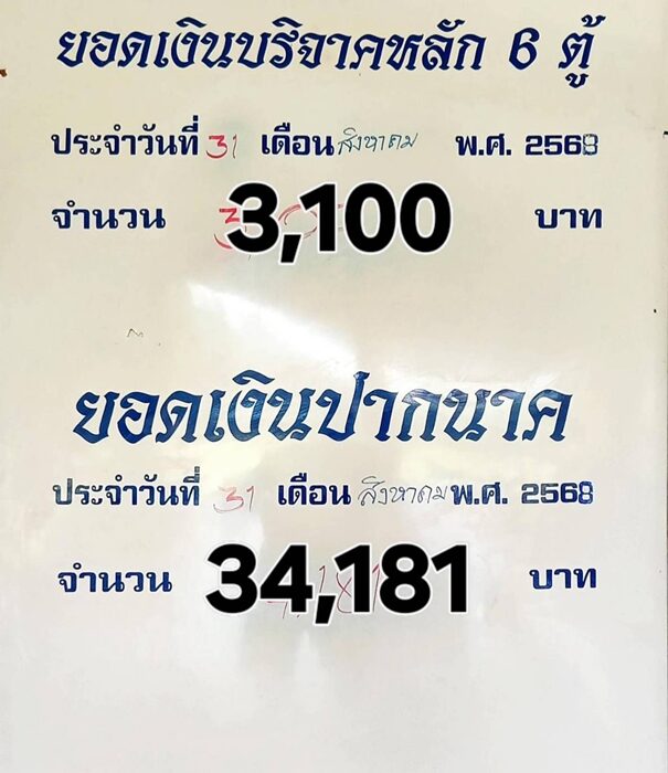 สำหรับคอหวยคำชะโนด วังนาคินทร์ดินแดนพญานาคราช พ่อปู่ศรีสุทโธและแม่ศรีประทุมมา อ.บ้านดุง จ.อุดรธานี ที่ยังไม่มีตัวเลขที่ชอบเพื่อตัดสินใจในวันนี้ ตามส่องเลขยอดเงินปากนาคที่กรรมการเงินนับยอดเงินได้ในวันที่ 31 ส.ค.ที่ผ่านมา ยอดรวมจำนวน 6 ตู้บริจาค จำนวน 3,100 บาท ส่วนยอดรวมเงินปากนาคยอดรวมจำนวน 34,181 บาท