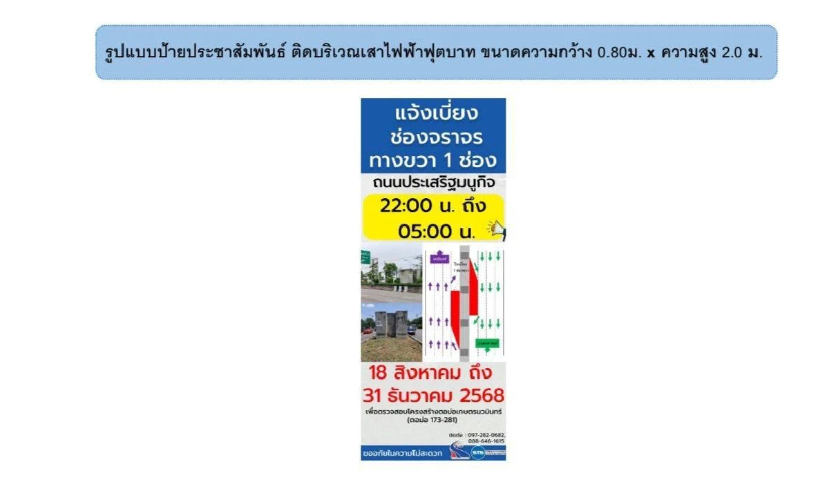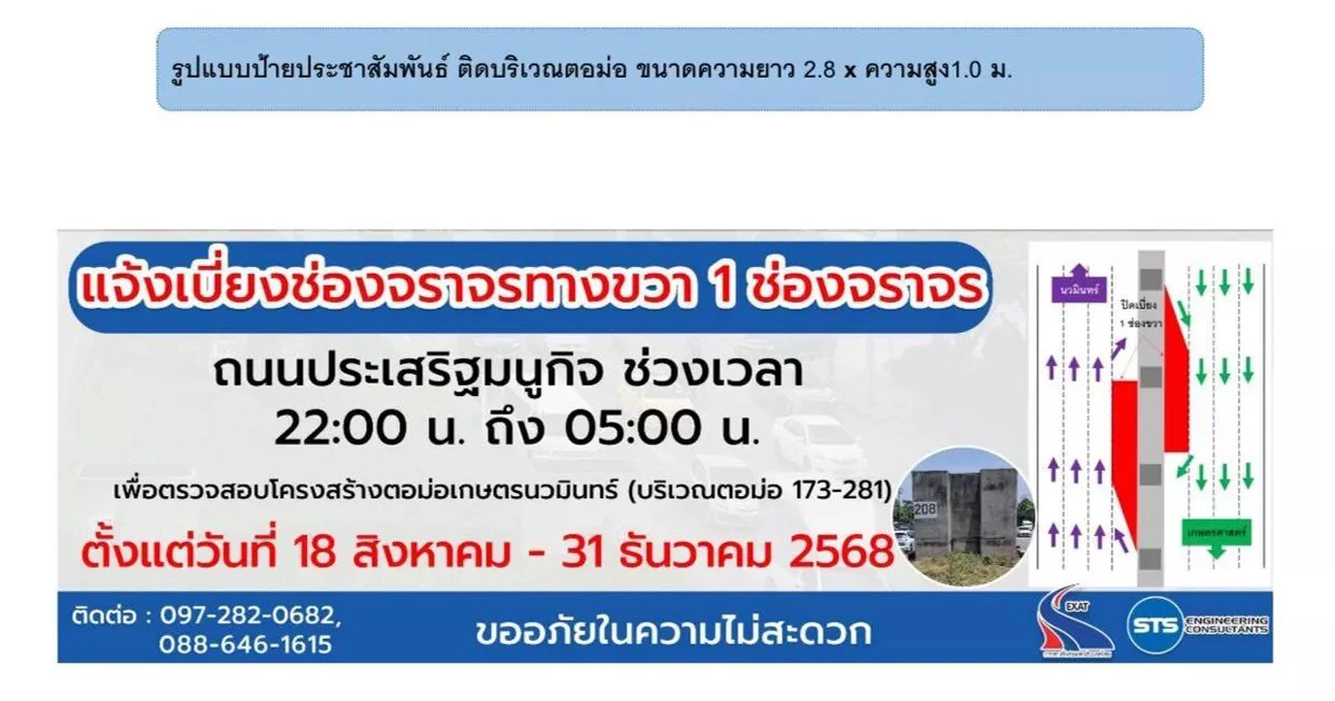 กระทบใครบ้าง คนกรุงเทพ เช็กเส้นทาง กทพ. แจ้ง ปิดเบี่ยงจราจร 136 วัน ยาวถึงสิ้นปี 68 ถนนประเสริฐมนูกิจ ตรวจสอบโครงสร้างตอม่อเกษตรนวมินทร์ (บริเวณตอม่อ 173-281) วางแผนการเดินทางในช่วงวัน