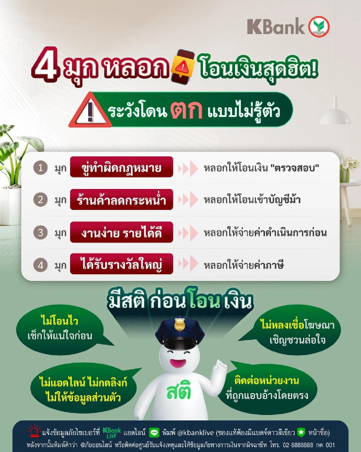 ธนาคารกสิกรไทย KBank เตือน 4 กลโกงยอดฮิต มิจฉาชีพหลอกโอนเงินแบบแนบเนียน แนะประชาชน “ตั้งสติ – ตรวจสอบก่อนโอนเงิน”