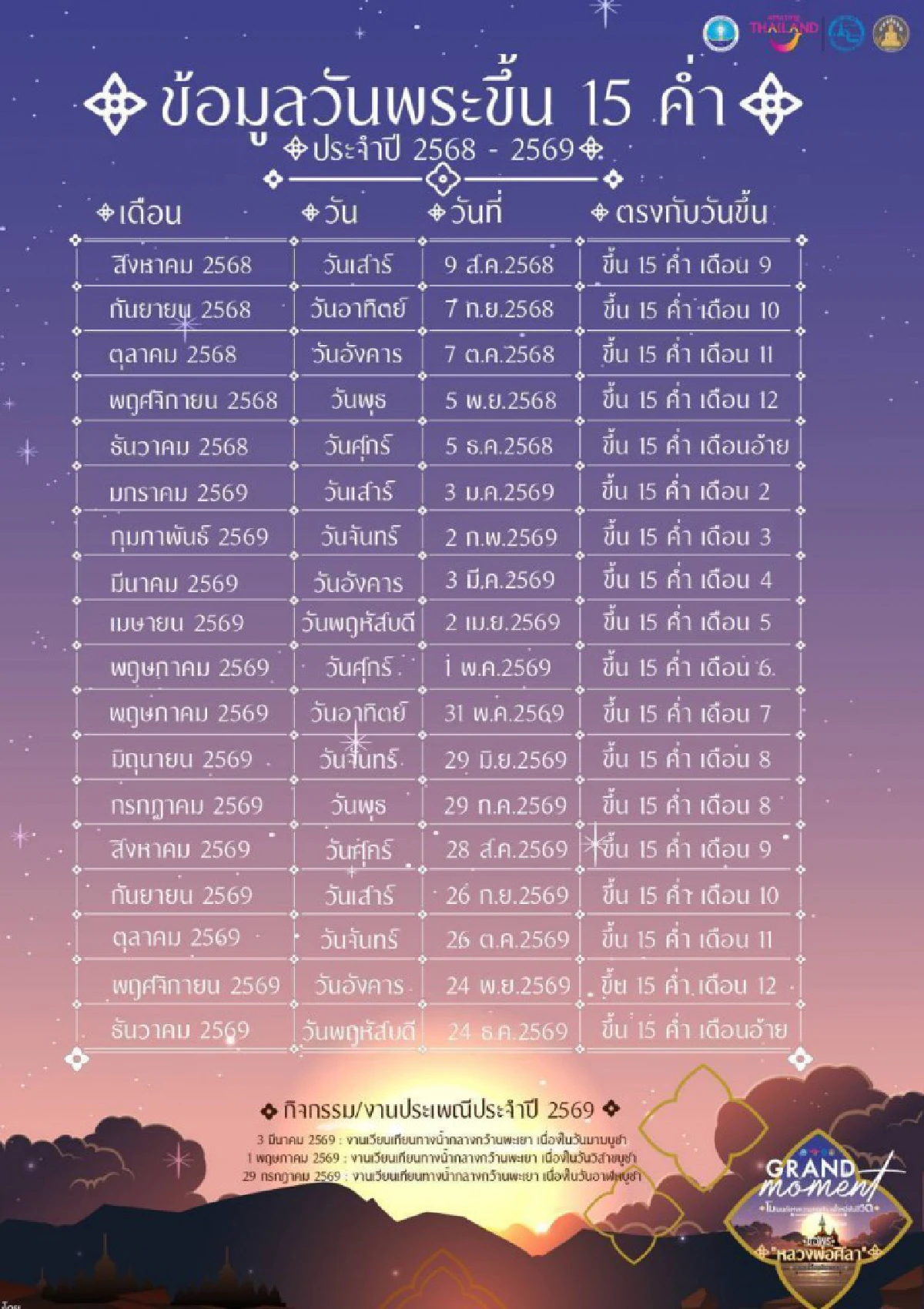 ในวันพระขึ้น 15 ค่ำ เวลา 17.00 -19.00 น.ของทุกเดือน ตลอดปี 2568-2569