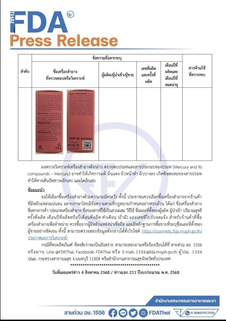 ผลตรวจวิเคราะห์เครื่องสำอางดังกล่าว ตรวจพบปรอทและสารประกอบของปรอท (Mercury and its compounds – Mercury) อาจทำให้เกิดการแพ้ ผื่นแดง ผิวหน้าดำ ผิวบางลง เกิดพิษสะสมของสารปรอท ทำให้ทางเดินปัสสาวะอักเสบ และไตอักเสบ