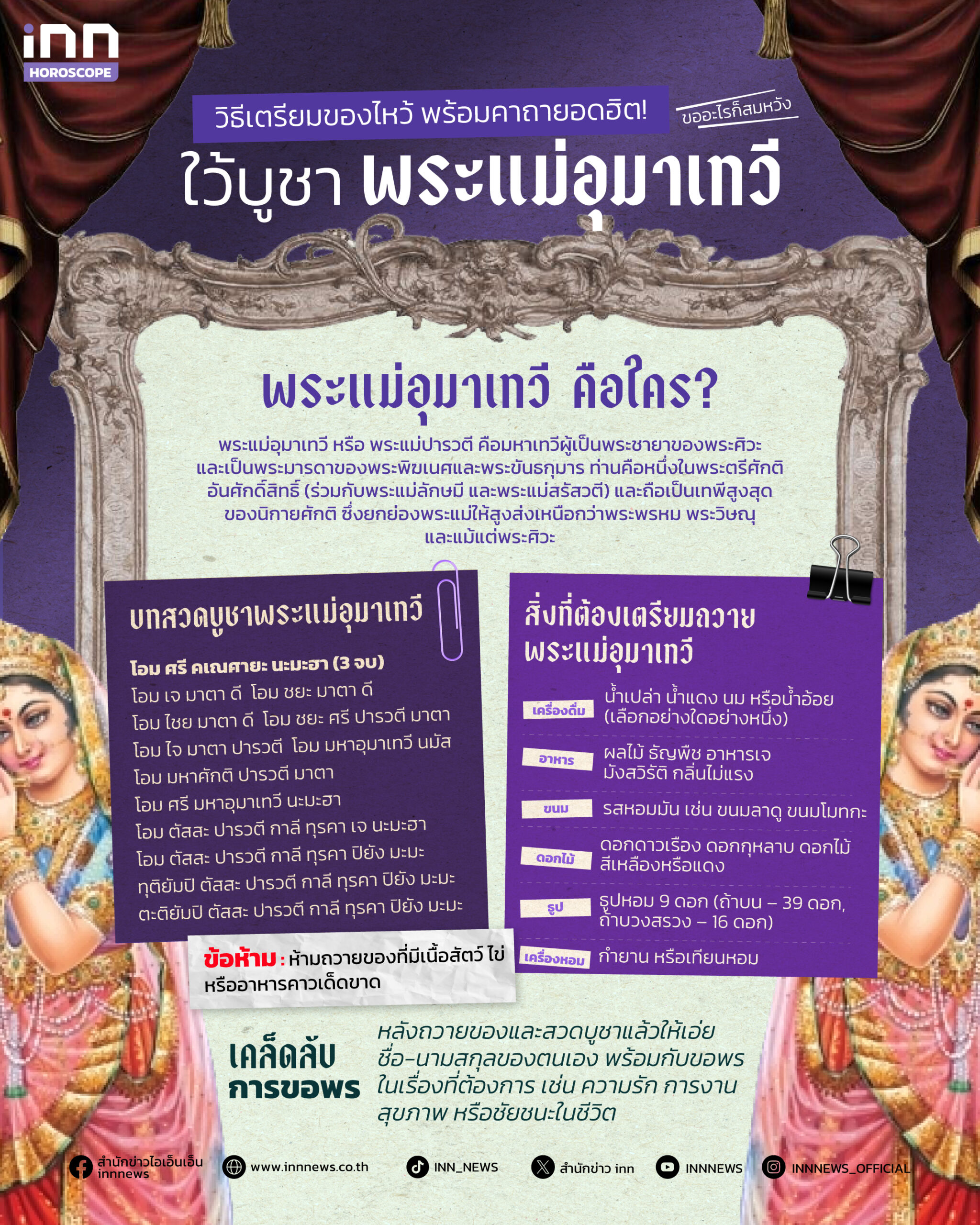ในบทความนี้ iNN Horoscope จะพาคุณไปรู้จักพระแม่อุมาเทวี พร้อมบทสวด วิธีบูชา เคล็ดลับถวายของ และวันที่ควรไหว้เพื่อเสริมดวงกัน